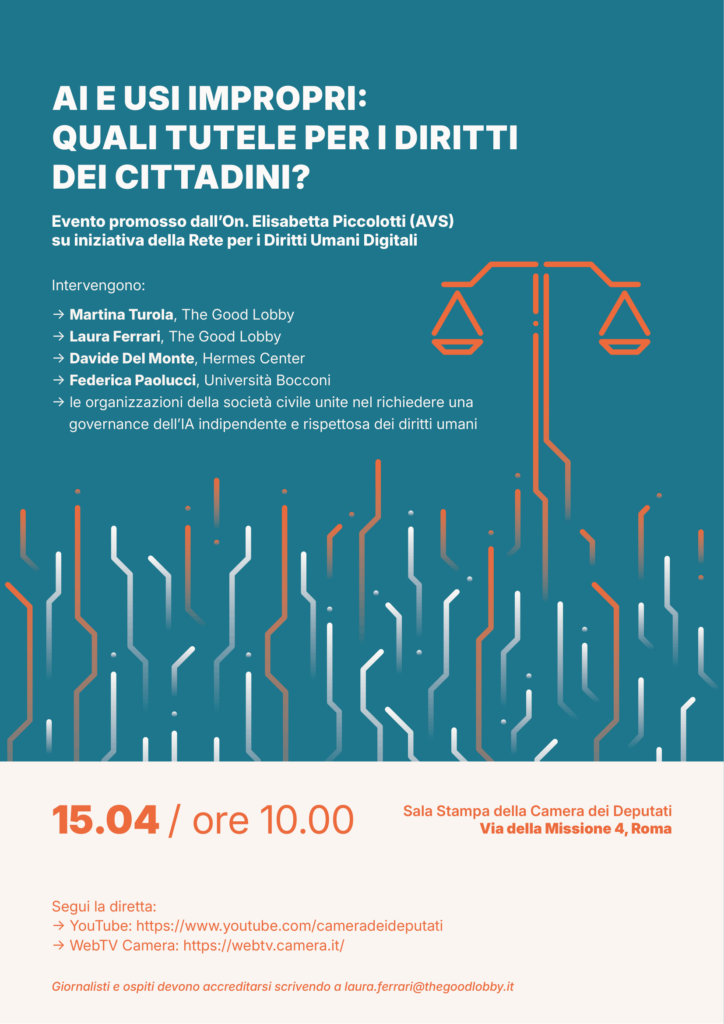 Mercoledì 15 aprile, dalle 10 alle 11 presso la sala stampa della Camera dei Deputati (via della Missione 4, Roma), presenteremo il policy paper Garantire i diritti nell’era dell’IA – Meccanismi di ricorso e tutela dei diritti alla luce del regolamento europeo sull’intelligenza artificiale, frutto della collaborazione tra Hermes Center e The Good Lobby Italia.